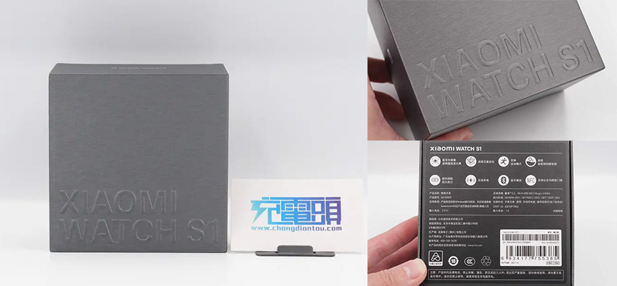 產(chǎn)品包裝盒趨于立方體,整體為灰色基調(diào),棱角分明,風(fēng)格簡約。包裝盒頂部壓印產(chǎn)品名稱——XIAOMI WATCH S1。包裝盒天地蓋設(shè)計,底部貼有產(chǎn)品銘牌,印有產(chǎn)品8大賣點、參數(shù)以及商家信息等,生產(chǎn)商為龍旗電子(惠州)有限公司,產(chǎn)品還通過了CCC認(rèn)證。
