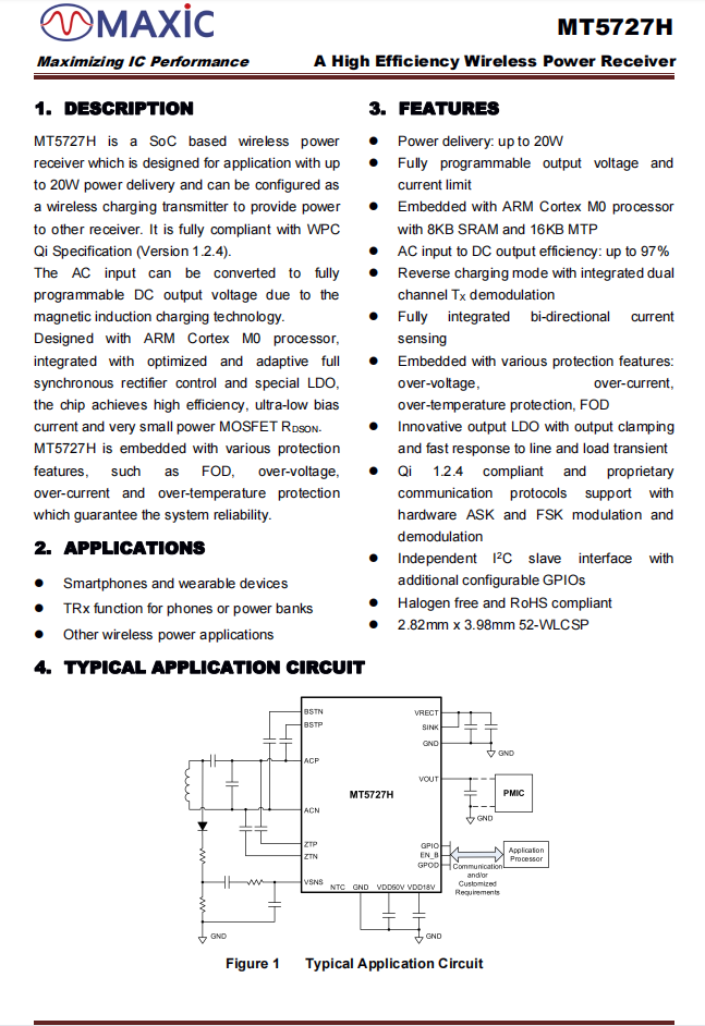 MT5727H內(nèi)置ARM M0處理器,搭配8KB SRAM和16KB MTP存儲器,支持私有無線充電協(xié)議,芯片內(nèi)部集成同步整流器和LDO,芯片內(nèi)置過壓過流保護(hù),支持I2C接口和可配置的GPIO接口。