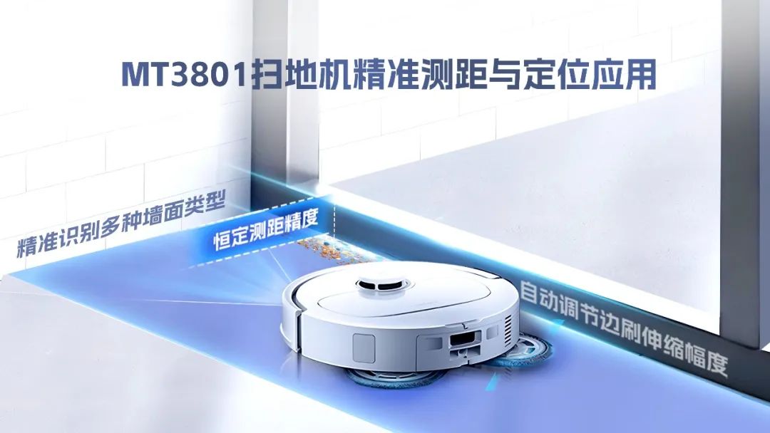 DTOF傳感器在沿墻模式下保持恒定測距精度,確保邊刷與墻面始終維持最佳間距,實現(xiàn)極限貼邊。同時,基于實時距離反饋,系統(tǒng)自動調(diào)節(jié)邊刷伸縮幅度,將墻角垃圾精準掃入主吸塵通道,還可精準識別多種墻面類型(如踢腳線、玻璃幕墻、凹凸磚墻等),并自動調(diào)整清潔策略。(點擊查看更多MT3801產(chǎn)品信息)