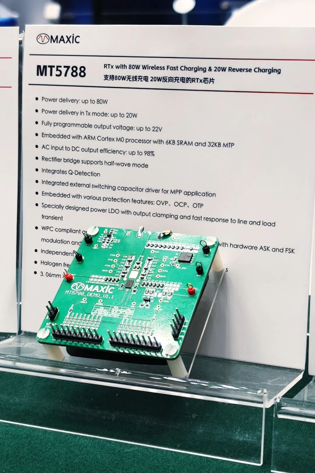 在無線充電接收端,重點(diǎn)展示了高度集成、高功率密度的36W無線充電RTX 芯片MT5708和高集成高效率支持BPP/EPP/MPP的100W無線充電RTX芯片MT5788。