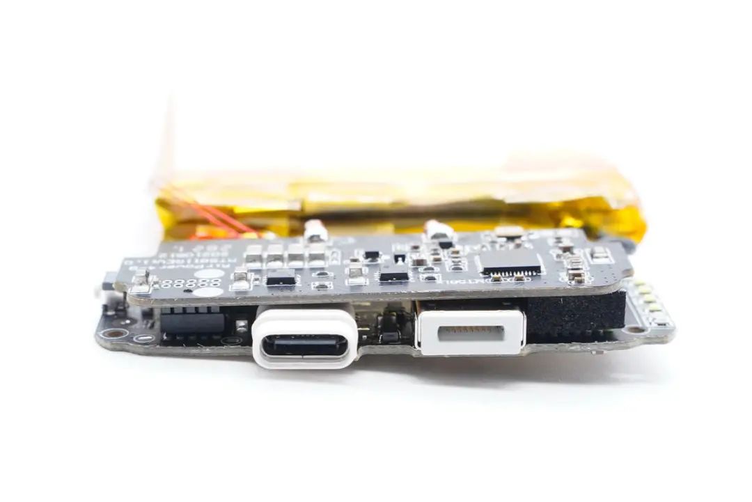 另一塊小板正面設(shè)有電感、接口保護(hù)MOS管、鋰電保護(hù)芯片等器件。