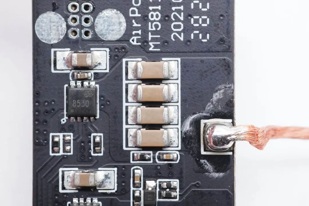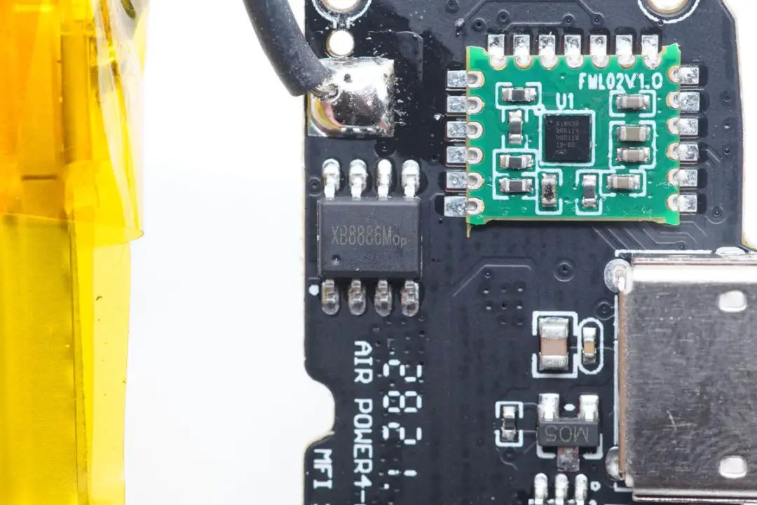 充電頭網(wǎng)通過拆解了解到,充電寶內(nèi)置兩塊PCB小板,之間有泡棉支撐。無線充方案采用美芯晟MT5811,這是一款高度集成的無線充電發(fā)射芯片,符合Qi標(biāo)準(zhǔn)以及高達(dá)15/50W的輸出功率,還集成ARM M0 處理器,總的來說在體積、兼容性、性能、效率等方面的表現(xiàn)都很好,能夠滿足客戶的各種要求。