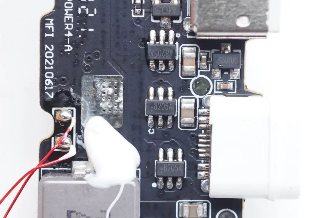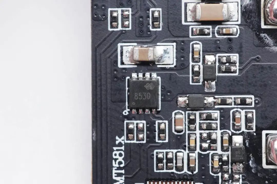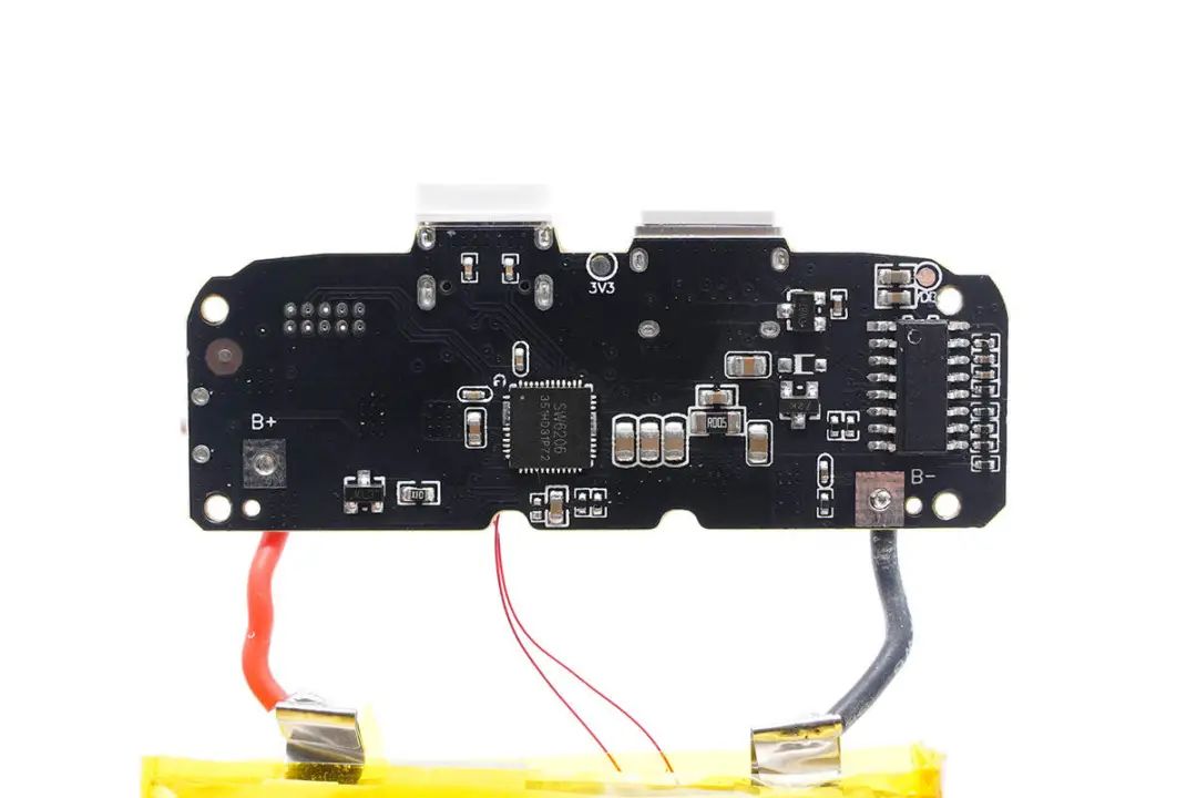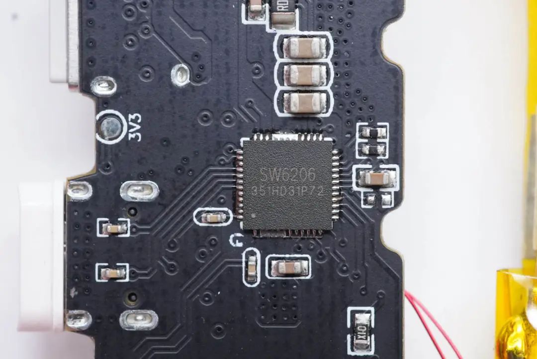 移動(dòng)電源主控芯片采用智融SW6206。這是一款高集成度的多協(xié)議雙向快充移動(dòng)電源專用多合一芯片,支持A+A+B+C+L口任意口快充。其集成了5A高效率開關(guān)充電,22.5W高效同步升壓輸出。