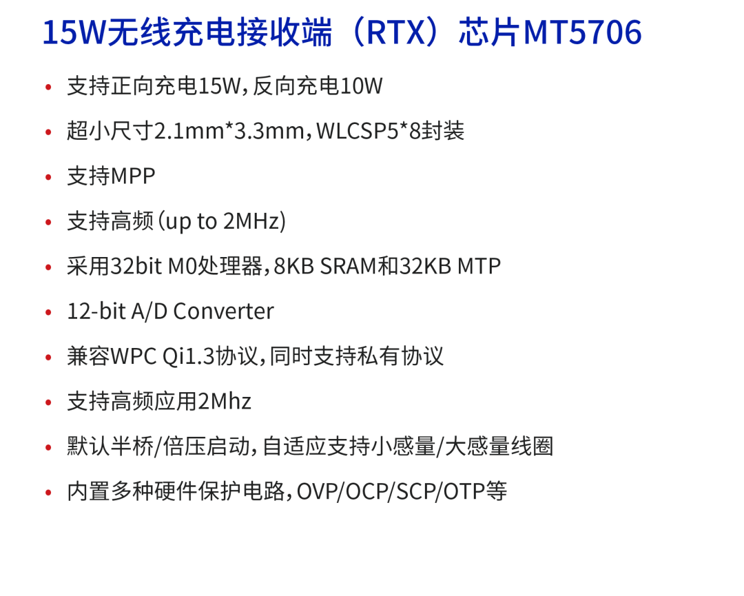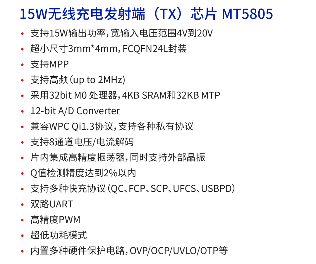 該方案可應(yīng)用于手機(jī)、PAD、可穿戴設(shè)備、智能配件、電動(dòng)牙刷、移動(dòng)電源、車載支架等中小功率消費(fèi)電子產(chǎn)品。MT5706+MT5805方案輸出功率可達(dá)15W。