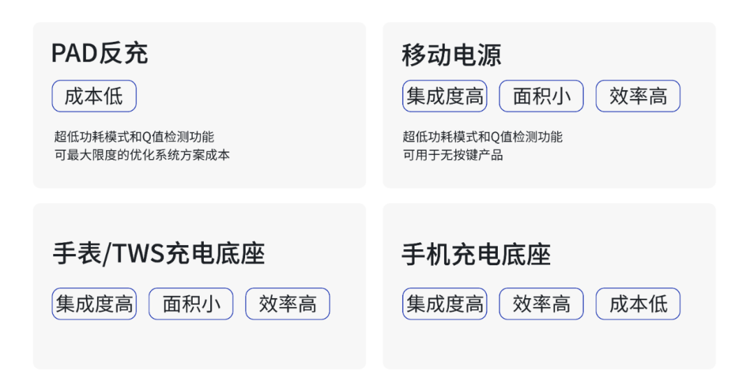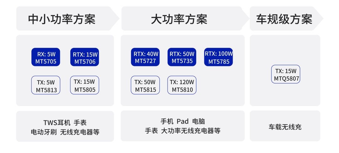 美芯晟在無(wú)線充電領(lǐng)域深耕數(shù)年,擁有全面覆蓋無(wú)線快充電源管理芯片的完整產(chǎn)業(yè)鏈核心技術(shù),關(guān)鍵性能指標(biāo)達(dá)到國(guó)際先進(jìn)水平,產(chǎn)品豐富度在業(yè)內(nèi)領(lǐng)先,可滿足中小功率、大功率、車規(guī)級(jí)等不同的終端產(chǎn)品應(yīng)用需求。