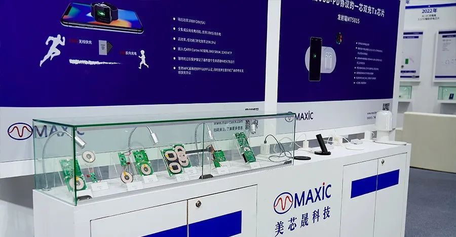 The Wireless charging exhibition area exhibited wireless power receivers represented by MT5785 that supports 100W wireless fast charging and 18W reverse charging, and transmitters represented by MT5815 that supports USB-PD protocol and has the ability of driving two coils. A large number of customers visited and had deep discussion with Maxic personnel.