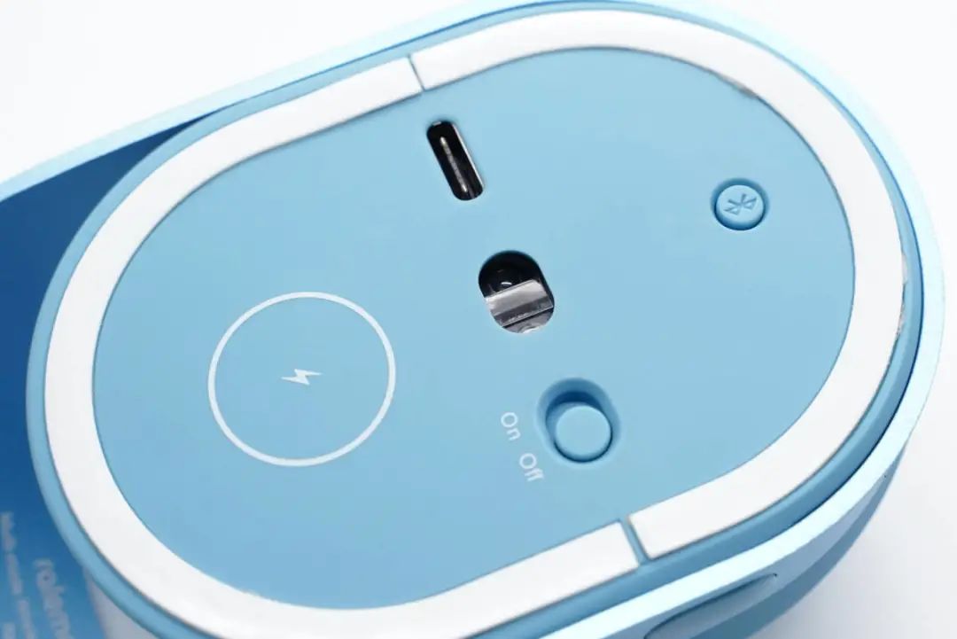 鼠標(biāo)底部邊緣貼有白色聚四氟乙烯腳墊,兩端分別是藍(lán)牙鍵和無線充電標(biāo)識,兩側(cè)是USB-C充電口和電源鍵。