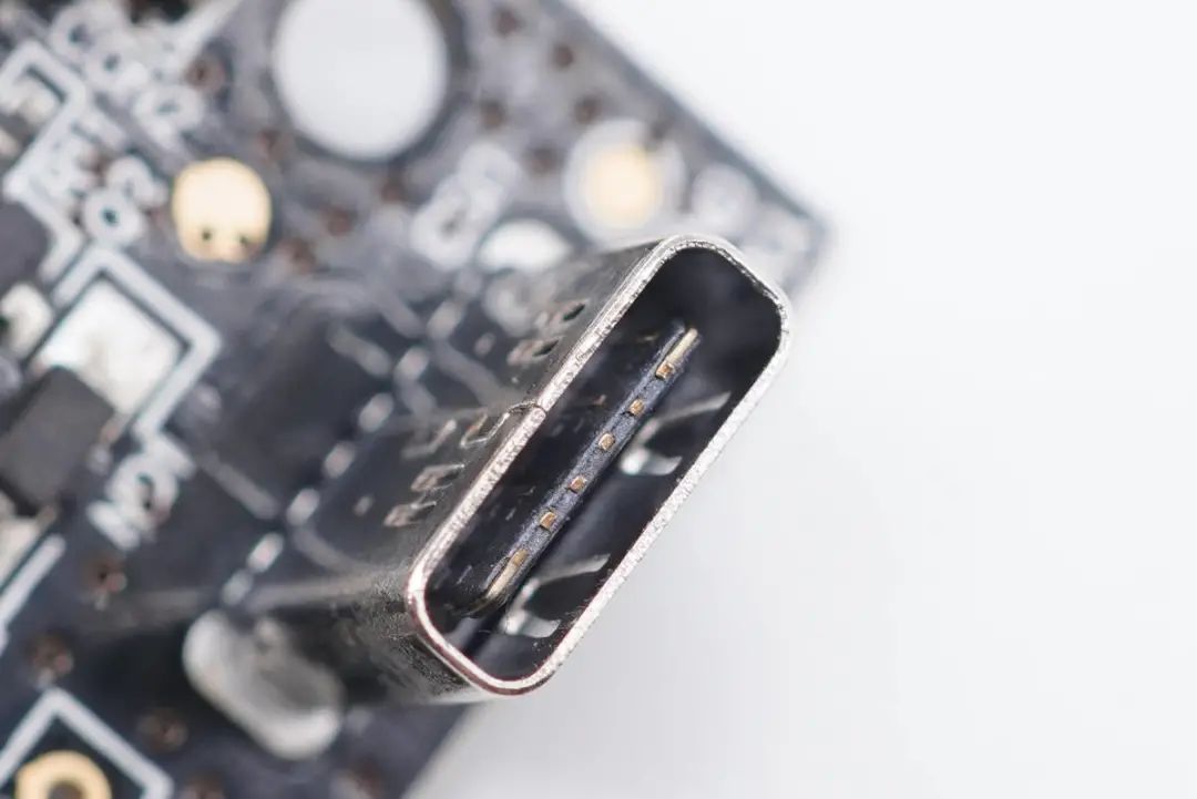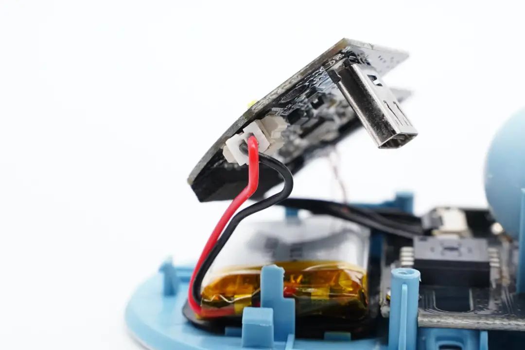 小板正面一覽,垂直焊接USB-C輸入母座,右側(cè)是電池插座,左側(cè)連接導(dǎo)線和無線充電線圈,中心是無線充電接收芯片。
