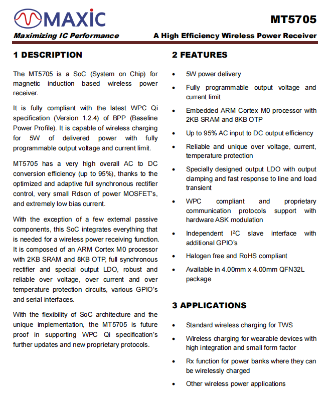 MT5705可提供穩(wěn)定的5W輸出功率,支持輸出電壓5V和電流最大1A,AC to DC轉(zhuǎn)換效率達95%;其擁有完善的過壓、過流、過溫保護機制,獨立的I2C通信接口和豐富的GPIO。封裝為4.00mm x 4.00mm QFN32L,尤其適合TWS耳機充電倉等各類小功率智能設(shè)備。