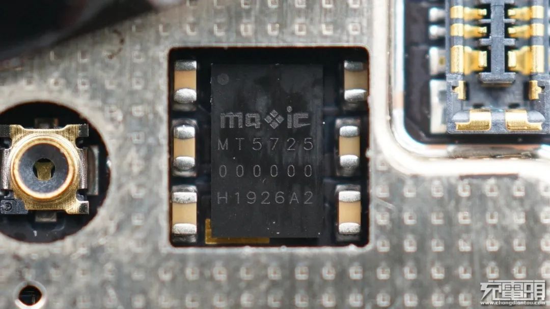魅族17 Pro內置4500mAh容量電池,支持30W有線充和27W無線充,使手機的充電性能達到主流5G旗艦機的快充水準。充電頭網通過拆解發(fā)現(xiàn),手機內部采用典型的三段式布局,層次分明。手機無線充電接收芯片采用美芯晟MT5725,這是一顆Tx和Rx二合一的雙模芯片,支持30W無線充以及10W反向充,性能強悍。此外無線充電線圈超薄設計,可有效降低手機厚度,芯片粘貼導熱墊和絕緣塑料片進行導熱和保護。