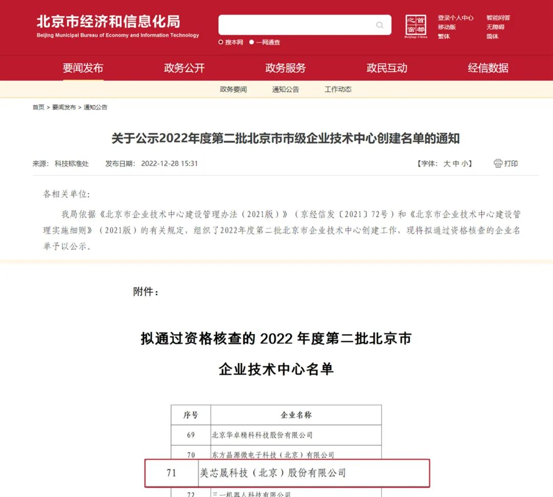 近日,北京市經(jīng)濟和信息化局公布了“2022年度第二批北京市市級企業(yè)技術中心名單”,美芯晟獲批“北京市市級企業(yè)技術中心”資質(zhì)。