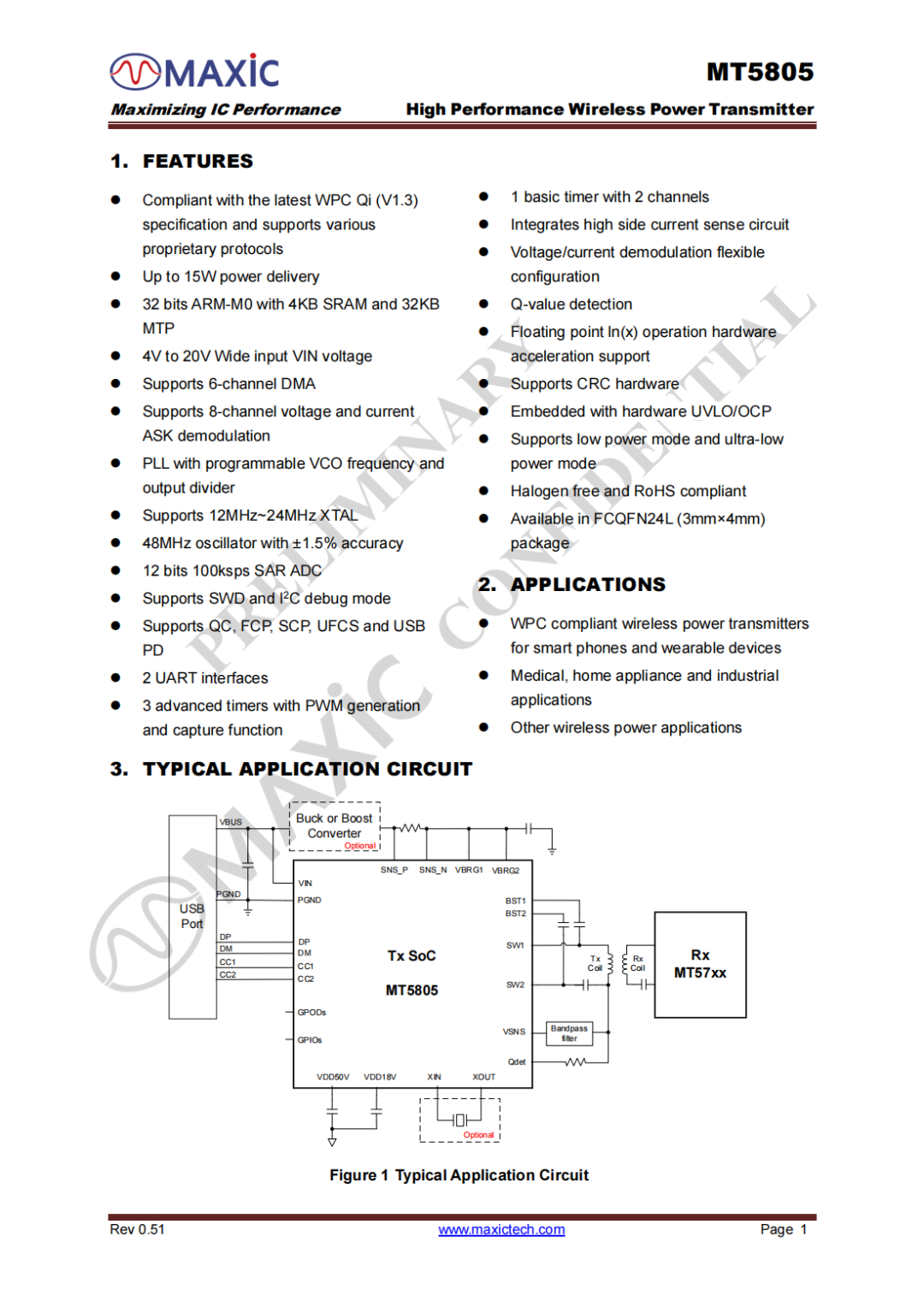 MT5805是單芯片解決方案,內(nèi)部集成32位M0處理器,32KB MTP存儲(chǔ)器和4KB SRAM,符合WPC Qi 1.3規(guī)范,支持私有無(wú)線充電協(xié)議,支持功能定制。芯片支持15W輸出功率,4-20V輸入電壓,內(nèi)置快充取電功能,支持UFCS融合快充,PD3.0,QC,F(xiàn)CP,SCP協(xié)議,支持單芯片無(wú)線充電器應(yīng)用。