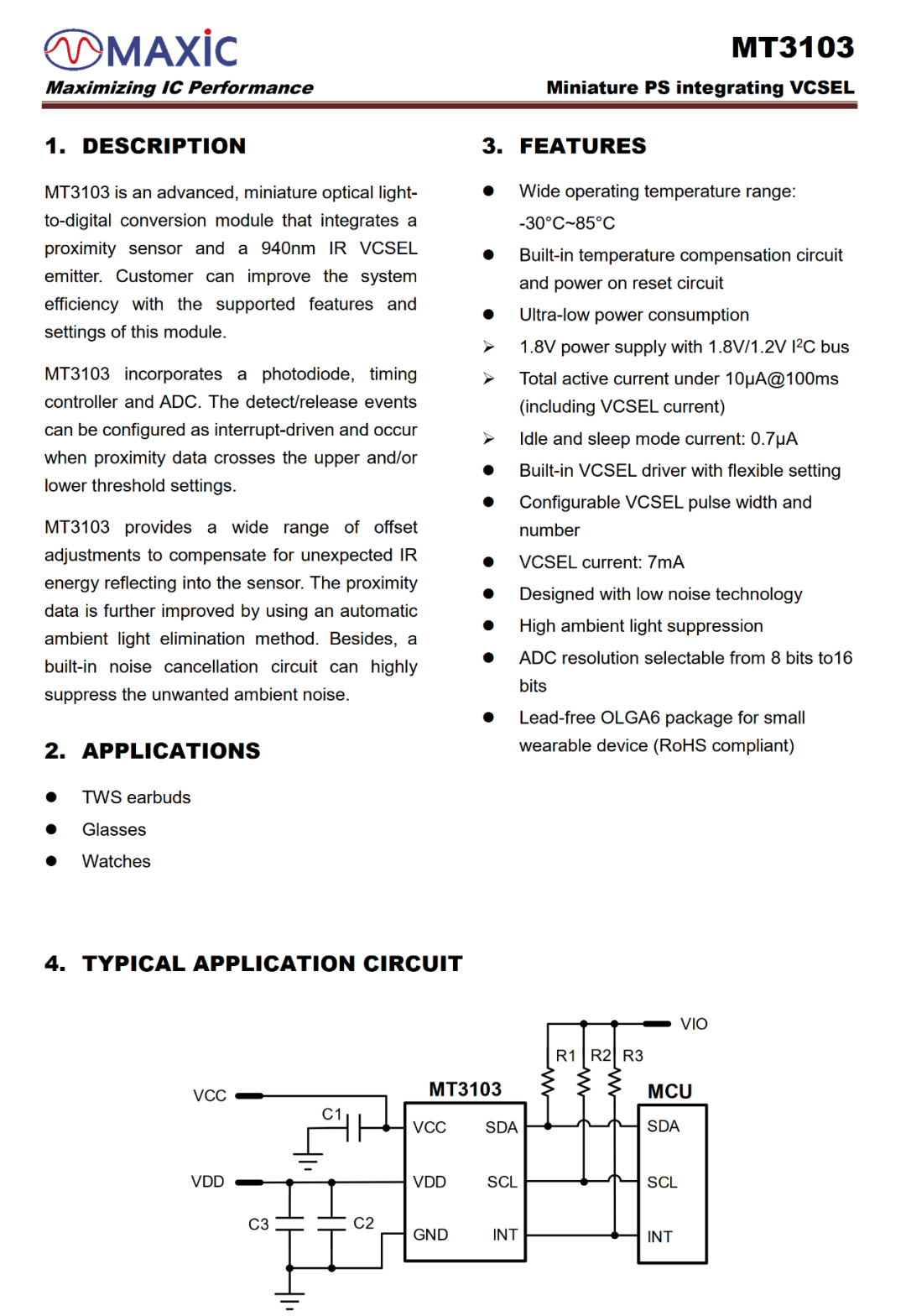 MT3103系列是一款小尺寸、超低功耗、高信噪比、集成940nm VCSEL的數(shù)字光學(xué)接近傳感器,待機(jī)功耗低至0.7uA,配有公司自研自適應(yīng)底噪抑制算法,有效提升入耳檢測(cè)效率。主要應(yīng)用于TWS/OWS等無(wú)線藍(lán)牙耳機(jī)、VR/AR智能眼鏡、智能手表、便攜式智能硬件產(chǎn)品等。